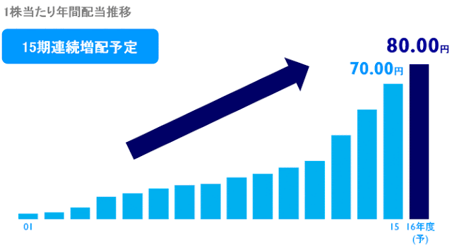 株式分割を繰り返しており、14年前の配当金がよくわかりませんが、16年度は70円から80円に+14%の増配予定です。