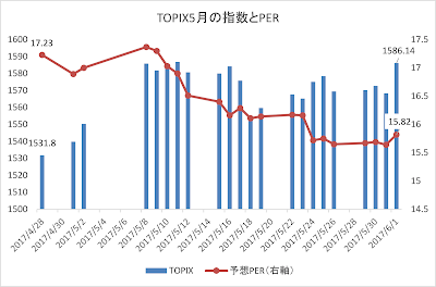 これはTOPIXの連休前から6月1日までのTOPIX指数とPERの関係をグラフ化したものです。